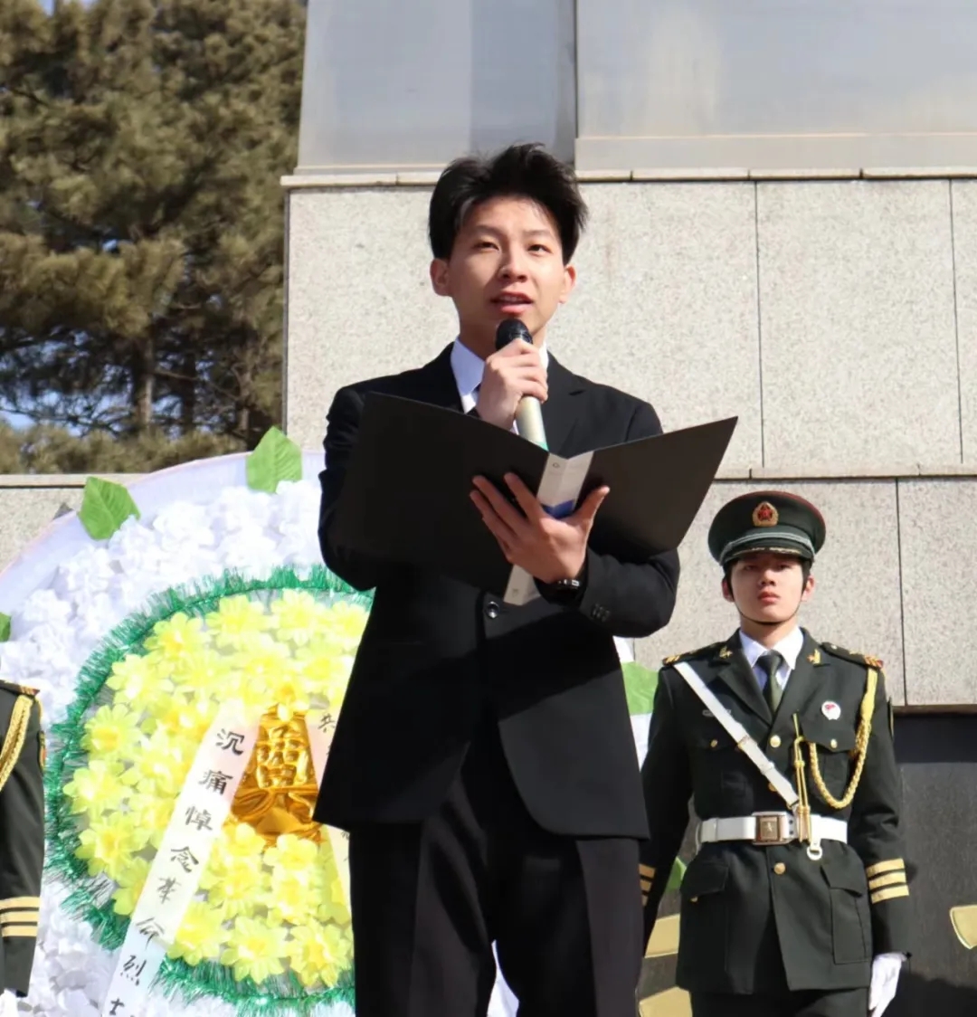 默哀结束后,21级经济与管理学院孟凡泽同学代表全体学生发言,向先烈们表达最深沉的怀念和敬意。并鼓励我校学生要用青春热血不懈奋斗,立志成材,超越自我,报效祖国!