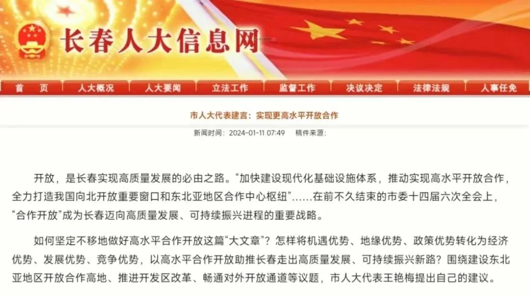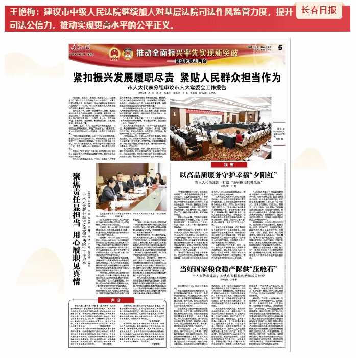 “全面反映了市法院围绕中心、服务大局的原则和人民至上、司法为民的宗旨。”“建议市中级人民法院继续加大对基层法院司法作风监管力度,提升司法公信力,推动实现更高水平的公平正义。”“想要加快发展,就必须扩大开放、深化合作。”长春市人大代表、吉林省东鳌鹿业集团董事长、长春科技学院副校长王艳梅说。