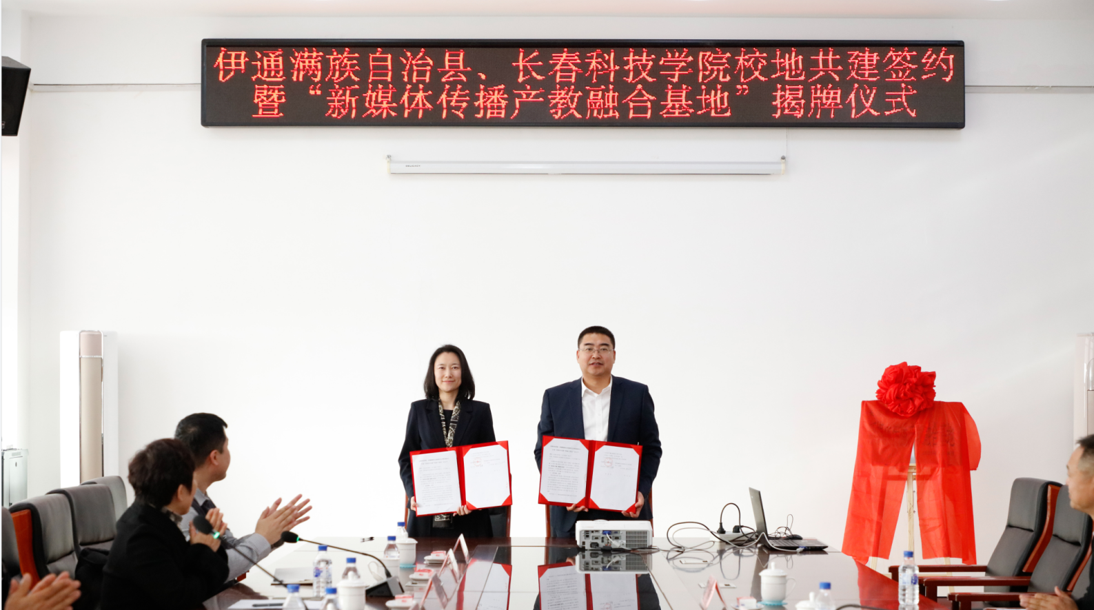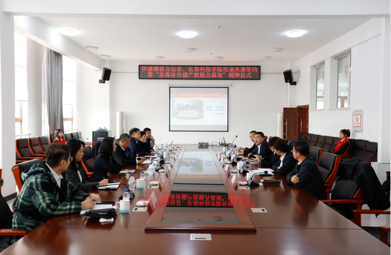 12月8日,长春科技学院与伊通满族自治县校地共建签约暨“新媒体传播产教融合基地”揭牌仪式在伊通满族自治县新时代文明实践中心(县委党校)举行。长春科技学院校长栾立明,副校长张代治,党委副书记、宣传部部长高芳出席活动。伊通满族自治县政协党组书记、主席张亚冰,县委常委、宣传部部长孙大太,县政府副县长胡冰洁,县委宣传部部务委员、文明办主任李和参加活动。长春科技学院语言文化·新媒体学院院领导、网络与新媒体专业师生代表出席活动。会议由县政府副县长胡冰洁主持。