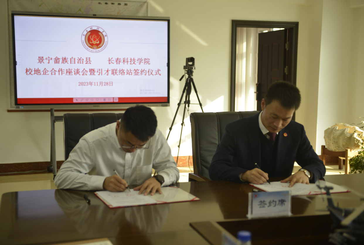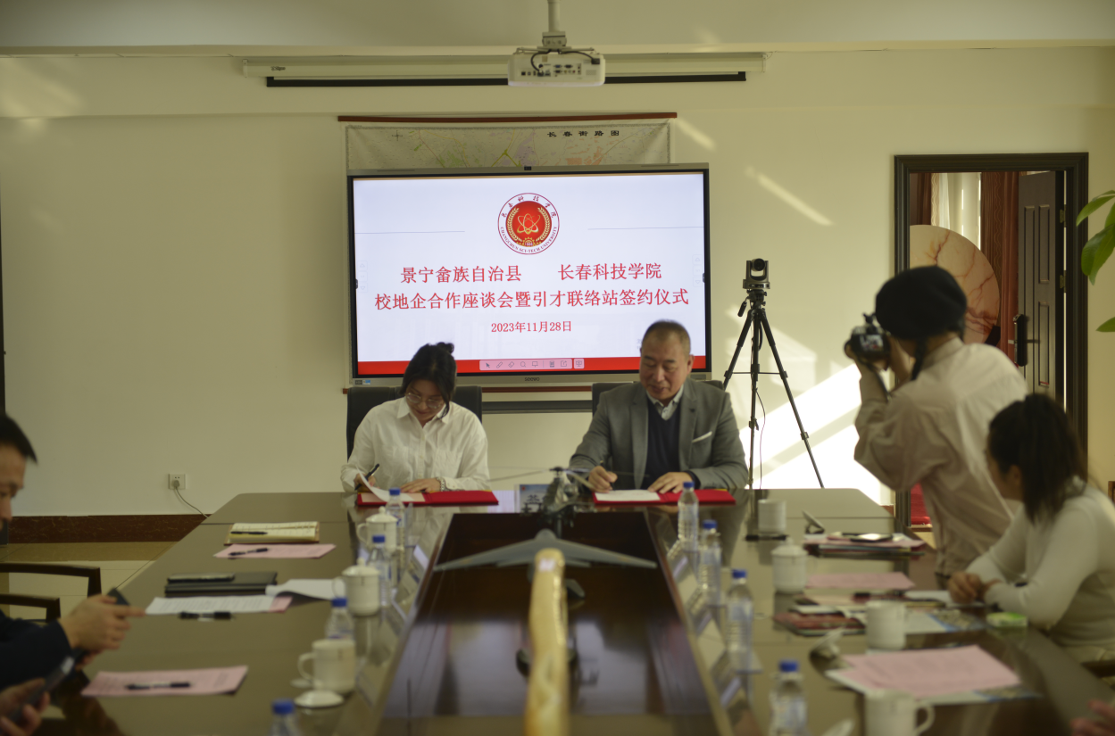 上午10时30分,学校与景宁县校地合作座谈会暨引才联络站签约仪式在行政楼903会议室举行。景宁畲族自治县委组织部部长傅春霞,副部长徐永伟,县人力资源和社会保障局办公室主任季卫娟,浙江天造环保集团董事长聂海波,丽景民族工业园管委会人事人才工作负责人、工会副主席李芳菲,县人才管理服务处主任董王炜,县人才管理服务处副主任刘益,东华教育集团董事局主席、长春科技学院董事长张电达,党委副书记宋学山,党政办公室主任孙大伟,创新创业学院、智能制造学院院长杨继,吉林职业技师学院党总支书记臧连兴,长春科技学院职业技术学院党总支副书记王东红参加此次座谈会。会议由就业工作处处长于斌主持。