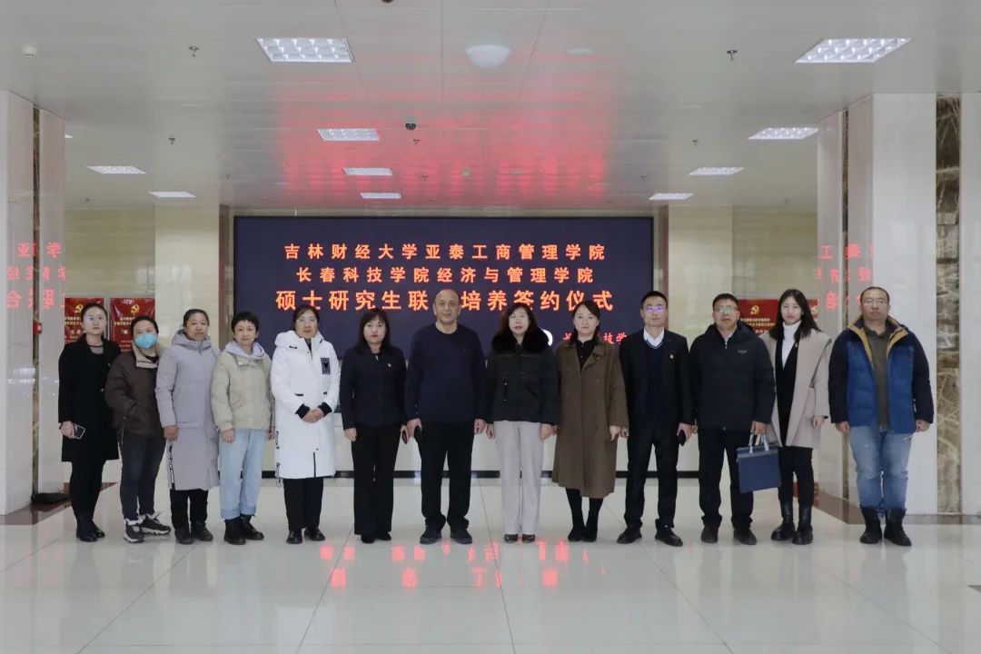 11月14日,长春科技学院经济与管理学院与吉林财经大学亚泰工商管理学院在我校行政楼903会议室举行硕士研究生联合培养签约仪式。吉林财经大学亚泰工商管理学院院长崔宏桥,副院长兼MBA教育中心主任盛亚军,MBA教育中心办公室主任焦连城、管理干事韩童,长春科技学院学术委员会主任、工商管理学科带头人戚欣,副校长高杰,经济与管理学院院长王晓光等相关领导,学科建设办公室全体人员出席仪式。签约仪式由科研处处长、学科建设办公室主任陈前主持。