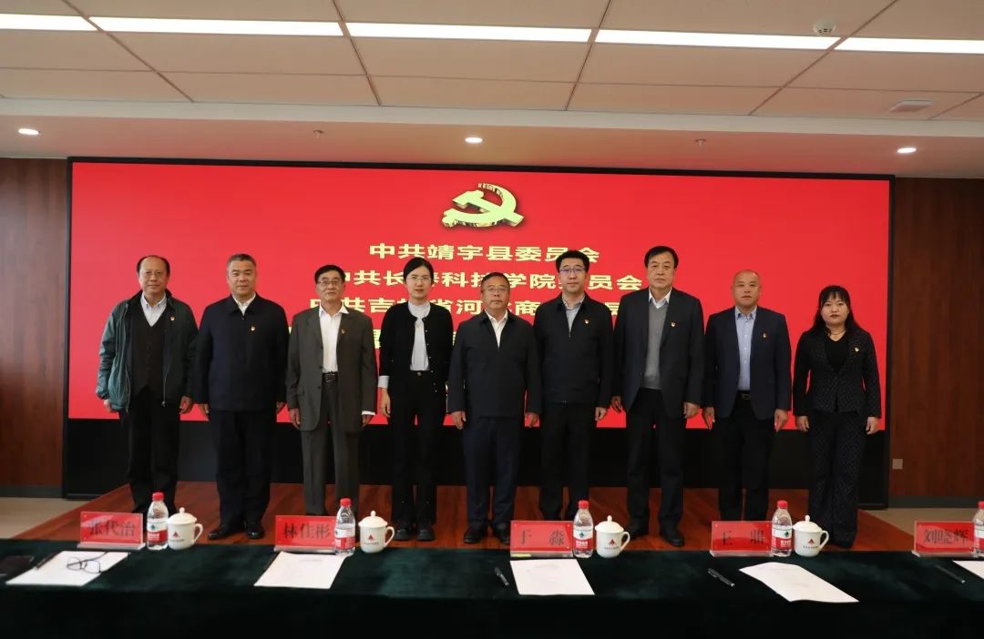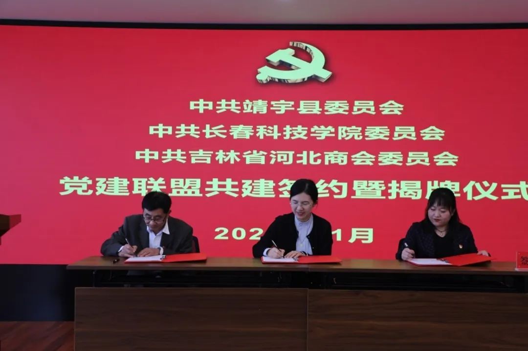 靖宇县委副书记王鼎、学校副校长高杰、吉林省河北商会党委书记赵忠文分别代表中共靖宇县委员会、中共长春科技学院委员会、中共吉林省河北商会委员会签署党建联盟协议书。