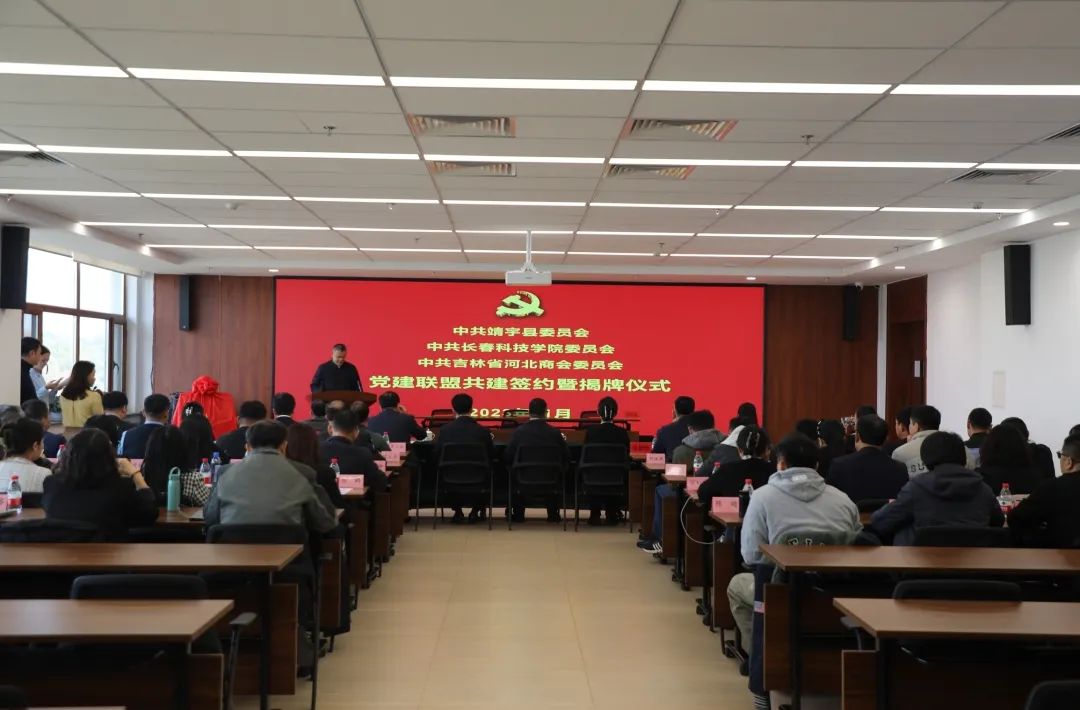 靖宇县委书记于淼、学校党委书记林佳彬、吉林省河北商会党委书记赵忠文分别代表中共靖宇县委员会、中共长春科技学院委员会、中共吉林省河北商会委员会为党建联盟揭牌。