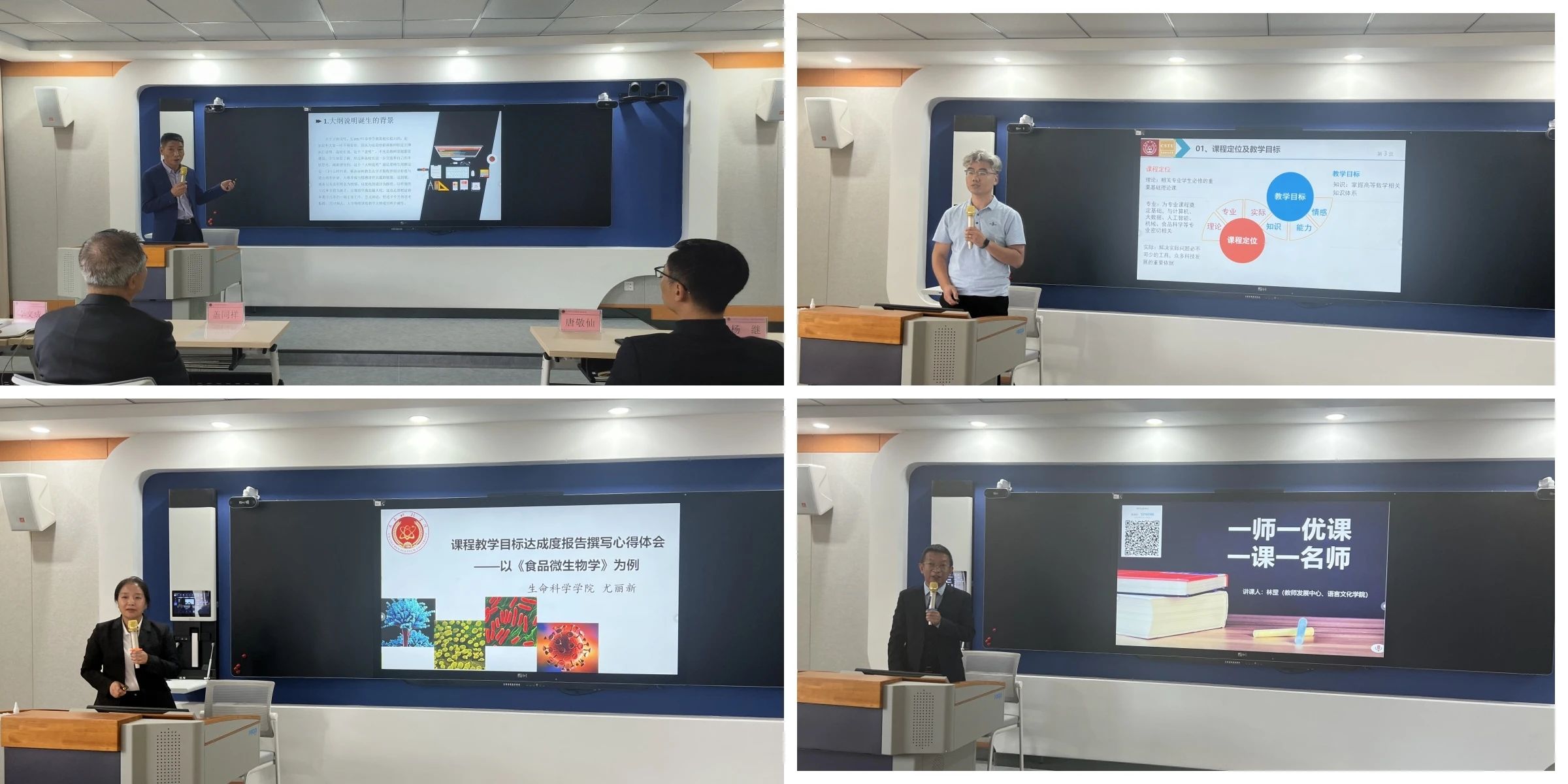 会议第二项内容,由课程建设优秀教师代表,结合主讲课程分别做课程建设经验分享报告。胡铁军教授从课程整体建设角度进行了经验分享;杜秀国教授重点分享了课程教学大纲说明解读;王健副教授以《高等数学》为例,重点介绍了课程内容的整合和教学方式方法;尤丽新教授介绍了课程教学目标达成度报告撰写的心得体会;林罡副教授重点分享了课程思政建设和课程建设过程中的注意事项。