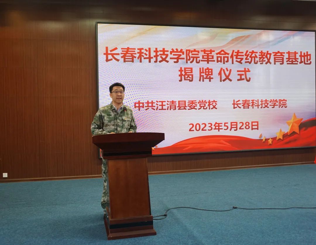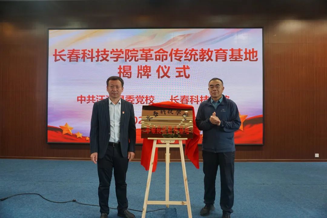 在活动最后,进行了长春科技学院革命传统教育基地揭牌仪式,长春科技学院董事长张电达与中共汪清县委党校常务副校长殷玉国共同揭牌。