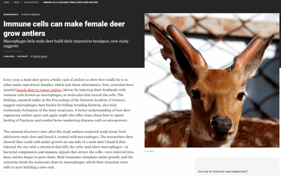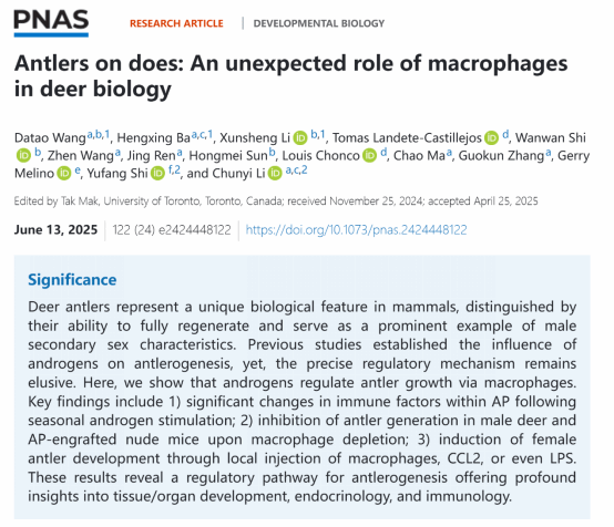 近日,《美国国家科学院院刊》(PNAS)在线发表了长春科技学院鹿茸科学与产品技术研究所李春义教授团队与苏州大学转化医学研究院时玉舫教授合作的突破性研究成果(图1)。该研究首次揭示,雄激素通过激活先天免疫系统中的巨噬细胞调控鹿茸发生,甚至能诱导雌鹿长出完整鹿茸。这一发现破解了鹿生物学领域百年未解之谜,为器官发生、再生医学及免疫调控研究提供了全新视角。《美国国家科学院院刊》是学术界公认的继《细胞》、《自然》和《科学》之后的第四大科学杂志。