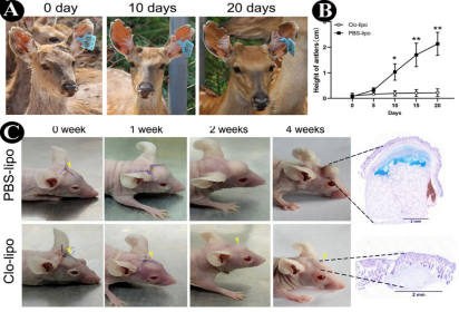 图2.使用氯膦酸盐脂质体(Clo-lipo)清除巨噬细胞后,严重影响了雄鹿茸的生长。A-B.雄性鹿茸的生长情况。C.裸鼠模型异种鹿茸的生长情况。