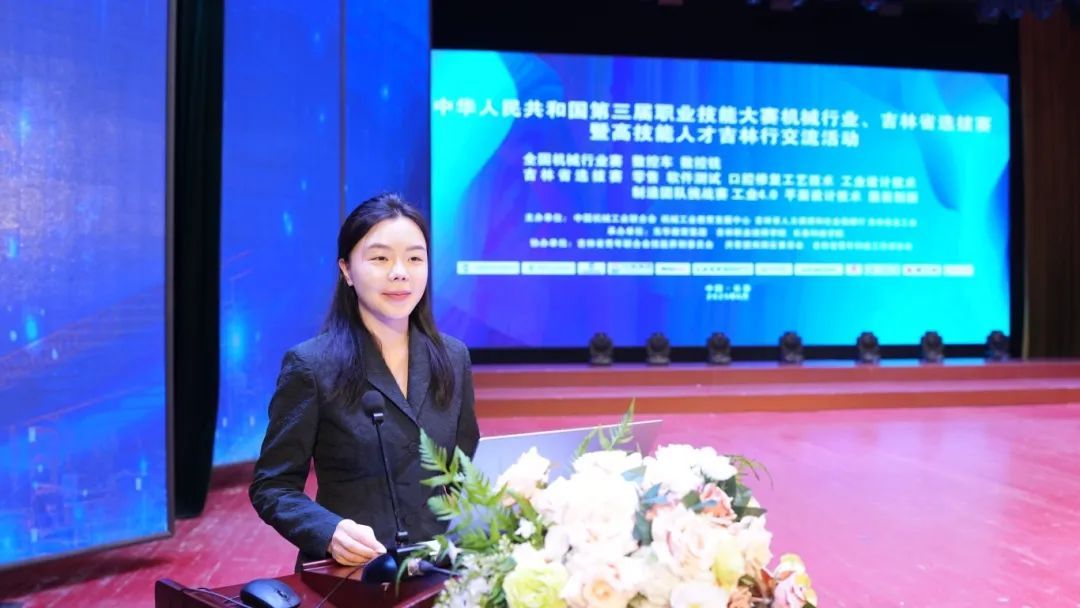 长春科技学院副董事长张津格致欢迎词。她代表集团向与会嘉宾表示热烈欢迎和诚挚感谢。随后从服务国家战略、推动地方产业转型升级、为区域振兴储备人才的战略高度阐释赛事作用并介绍集团培养高素质技能人才的创新路径。她强调,技能的精髓在于“动手”,人才的评价重在“实战”。 始终聚焦产业前沿技术,通过将“车间”搬进课堂、让“工单”成为教案,将行业标准与教学标准无缝衔接,致力锻造"用得上、干得好、留得住"的产业工匠。期盼通过活动吸引更多海内外机械领域的优秀人才关注吉林、了解吉林、选择吉林。