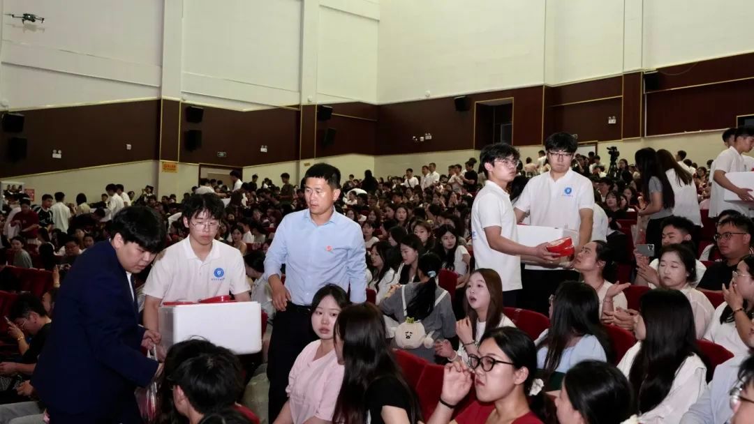 典礼现场温情涌动。背景屏幕滚动播放记录四年点滴的校园生活影像和师生共同包饺子的温馨画面。特别设置的送别环节感人至深,校领导与教师代表列队,将象征团圆与祝福的饺子送到即将启程的学子手中,伴随《凤凰花开的路口》的歌声,传递母校最朴实的牵挂。