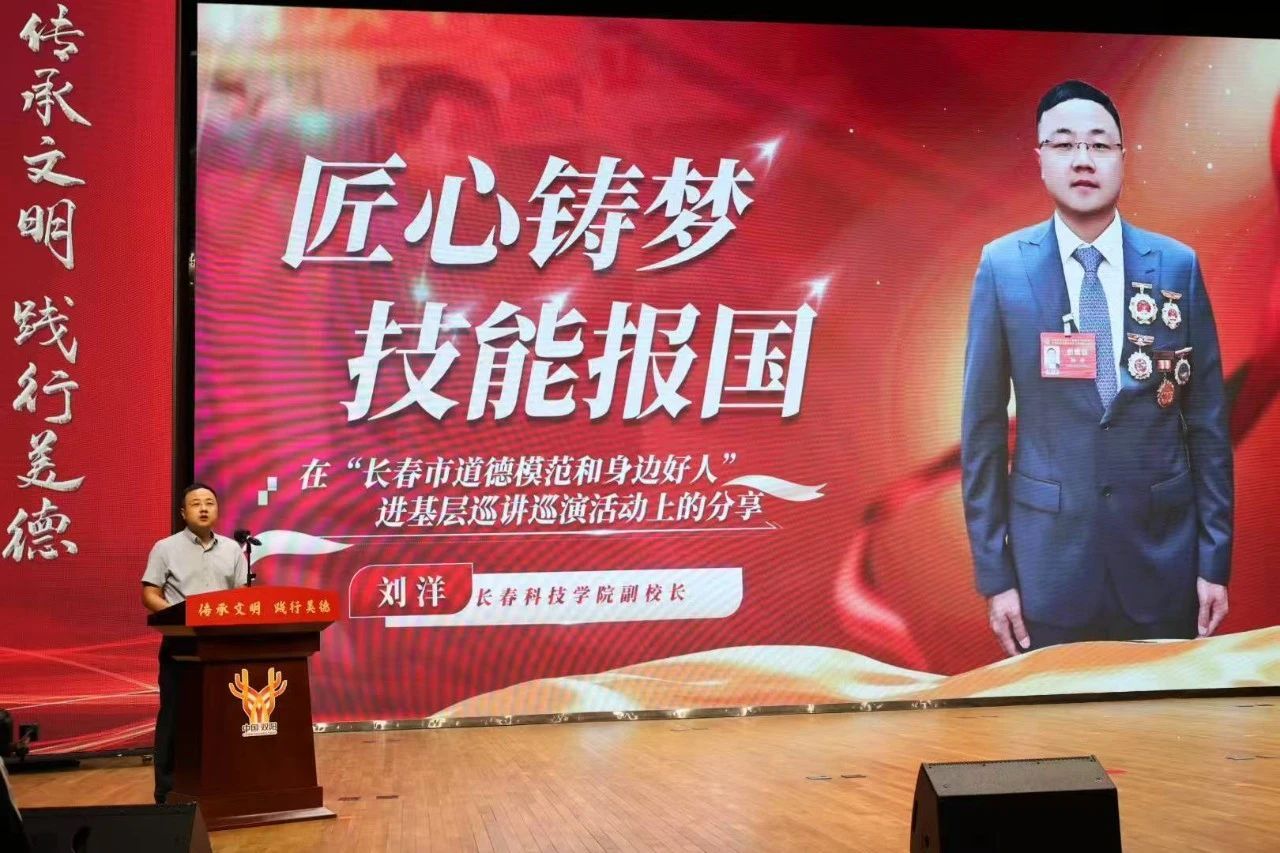 7月14日,“传承文明 践行美德——2025年长春市道德模范与身边好人进基层巡讲巡演活动”在双阳区委党校举行。全国劳动模范、长春科技学院副校长(特邀双阳城市榜样)刘洋分享了其从企业一线工匠到高校育人者的非凡经历,生动诠释了长春科技学院"匠心育人、德技双修"的办学理念,展现了学校培养高素质应用型人才的丰硕成果。