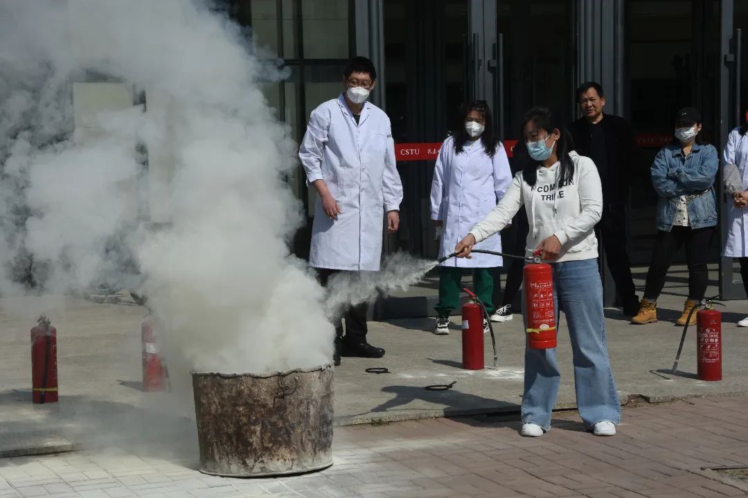接下来,卢老师带领全体馆员来到了图书馆正门外的空地,开展干粉灭火器实操演练。他向大家讲解了灭火器使用方法“四字口诀:一提二拨三握四压”和灭火时人要站在上风向或侧风向等知识要点。随后全体馆员依次提起灭火器,进行实操演练。在演练过程中,王柱石副处长和卢老师及时纠正了个别馆员拿灭火器喷嘴高度不对,没有完全对准火焰根部等细节问题。通过真实演练,全体馆员切实掌握了灭火器的检查、使用方法及灭火技能,提升了个人“初期火灾”的扑救能力。