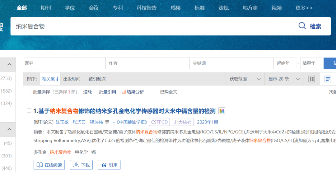 2、检索框输入检索词,点击检索,即可呈现检索词相关文献。根据需要选择其他选项即可。