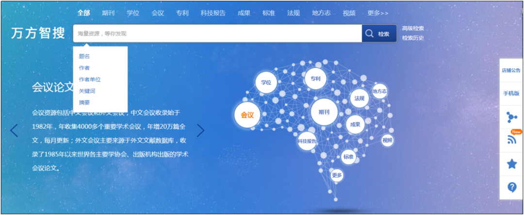 会议资源包括中文会议和外文会议,中文会议收录始于1982年,收录中文会议论文共计538万多篇;外文会议主要来源于外文文献数据库共计766万多篇。