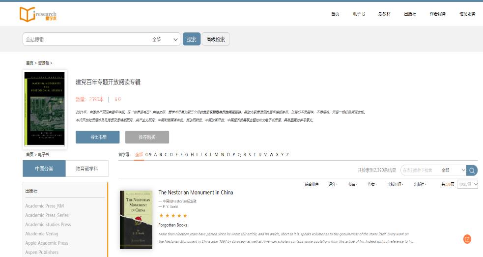 “爱学术”平台首页—点击“百年建党百年梦”轮播——即跳转到该专题资源集合,点击“试用”标志的图书即可全部支持在线阅读全文,但不支持下载。