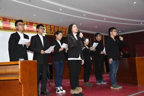 在竞赛最后比分统计时段,学校大学生朗读者联盟为现场师生带来了集体配乐诗朗诵《龙的传人》。充满激情的诗诵读,展示了我校大学生的爱国情怀和民族自豪感。