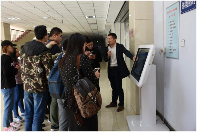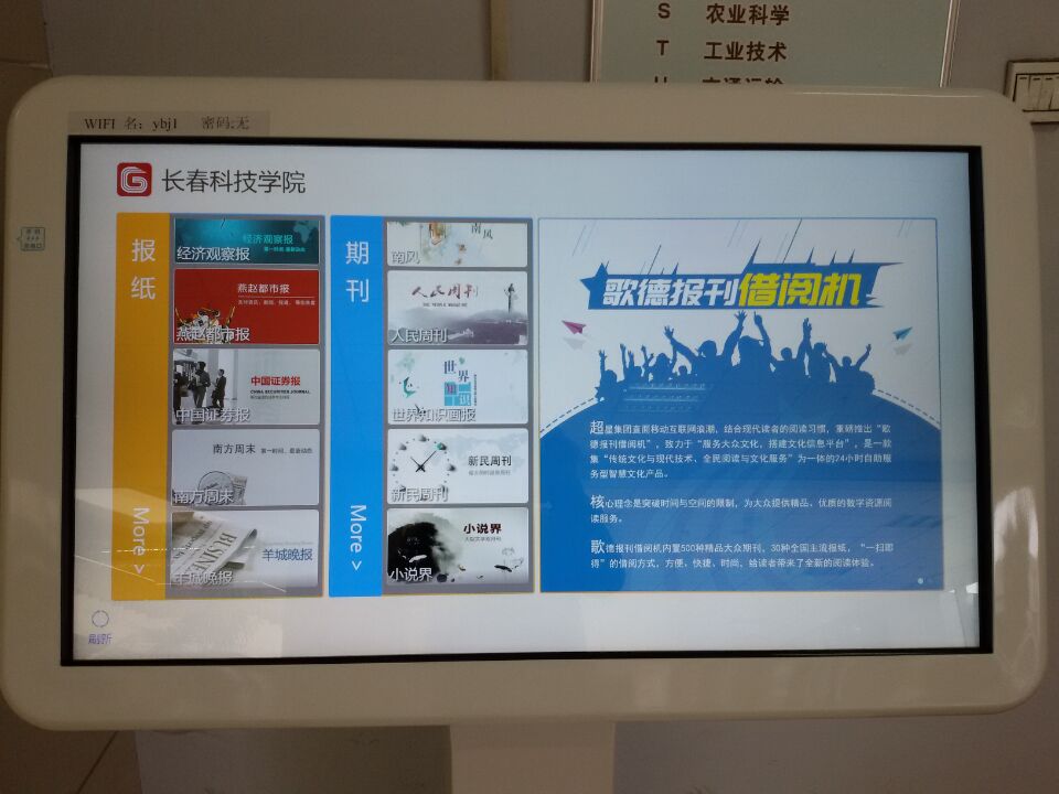 上午10点30分,学校图书馆开展了电子图书借阅机和电子报刊借阅机体验活动。今年4月份,图书馆新进试用1台歌德电子图书借阅机和试用2台歌德电子报刊借阅机,加上我馆2014年引进的1台歌德电子图书借阅机,目前我馆已经累计拥有4台电子图书期刊借阅机。这4台设备分别安置在学校图书馆一楼和二楼的借阅室门口。北京超星集团的陈迪经理向参加体验活动的师生讲解了如何利用电子图书借阅机、报刊机免费下载自己喜爱的书籍和期刊。目前,歌德电子图书借阅机内置3000册电子书,每月更新电子书150册。歌德电子报刊借阅机内置500种精品大众期刊,30种全国主流报纸。参加体验活动的师生纷纷拿起手机,通过“一扫即得”的方式,方便、快捷地下载到了自己喜爱的书刊。图书及报刊借机阅机提升了我校图书馆的服务水平,加速了图书馆数字化建设的进程。