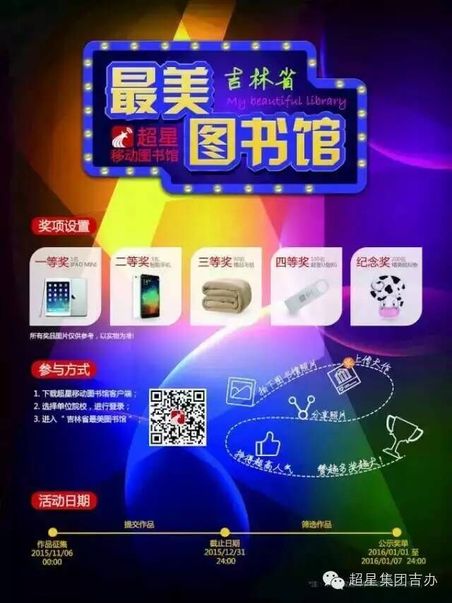 以下图片是此次活动海报内容,可查看活动奖品情况。另一张图片是超星移动图书馆的二维码,没有下载超星移动图书馆的读者可以扫描二维码即可下载,选择自己学校后用自己的读者借阅证号登录,登录后找到“吉林省最美图书馆”模块,点击进去即可参与此次“吉林省最美图书馆活动”。