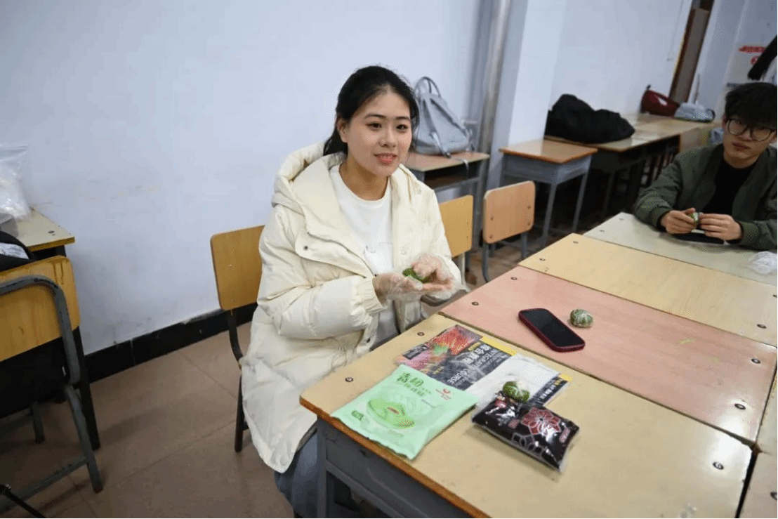 同学们一边动手制作,一边交流着自己家乡的清明习俗,现场欢声笑语不断,青团的香气弥漫在教室的每一个角落。很快,青团制作完成,大家将做好的青团放入冰箱冷藏。等待片刻后,口感清凉、软糯Q弹的青团新鲜“出炉”。