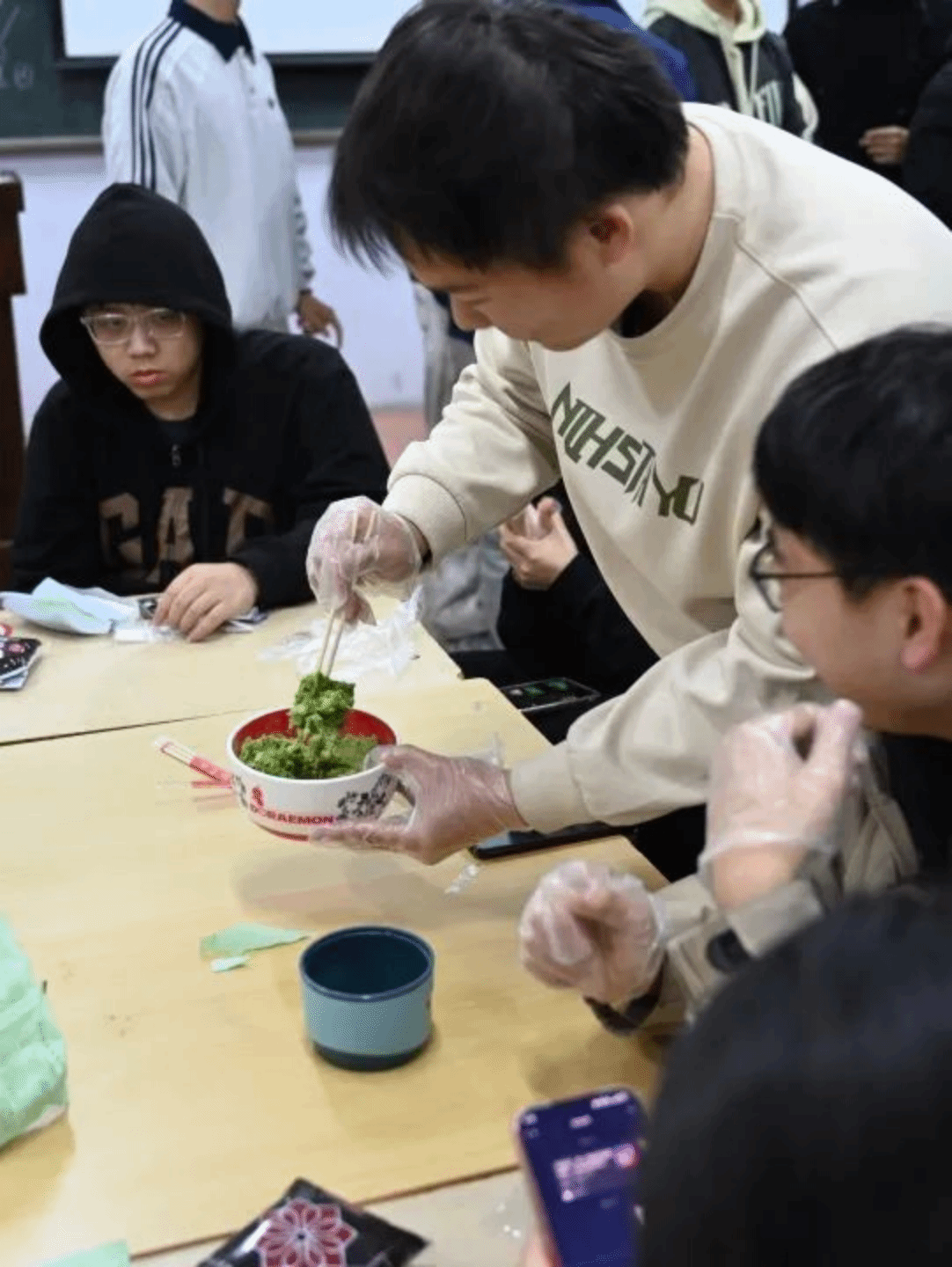 嫩绿的艾草汁散发着自然的清香,糯米粉在同学们手中逐渐变得柔软而有韧性。大家围坐在一起,相互协作,揉面团、包馅料,将对传统节日的敬意融入到一个个青团之中。社团成员还为大家讲解了青团在清明时节的文化寓意,从最初的传统节日寒食节传统,到如今成为人们缅怀先辈、寄托情思的象征,小小的青团承载着千年的历史记忆。
