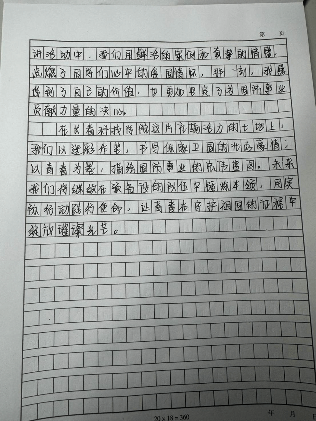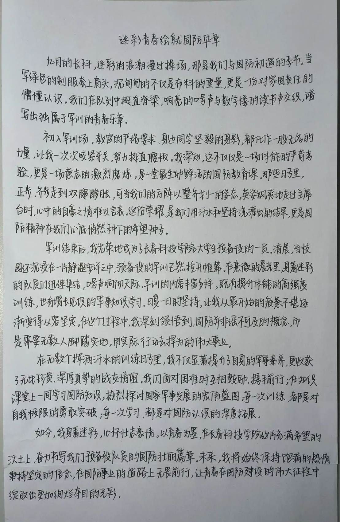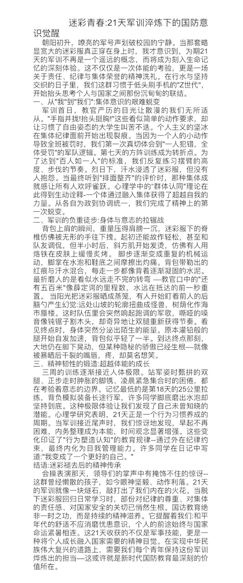 活动自开展以来,同学们踊跃参与。他们结合早训时的坚持、军训中的淬炼,生动描绘出国防力量在青年成长路上的深刻印记,字里行间满溢着炽热的爱国情怀与强烈的个人担当,一篇篇佳作展现出新时代青年对国家安全的深刻思考与守护家国的坚定信念。