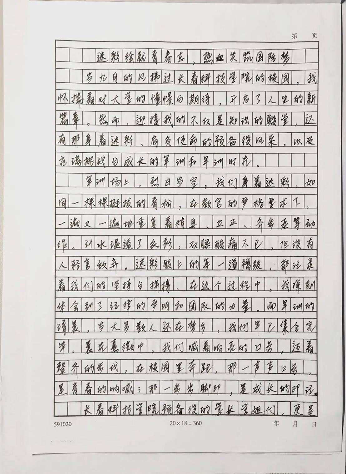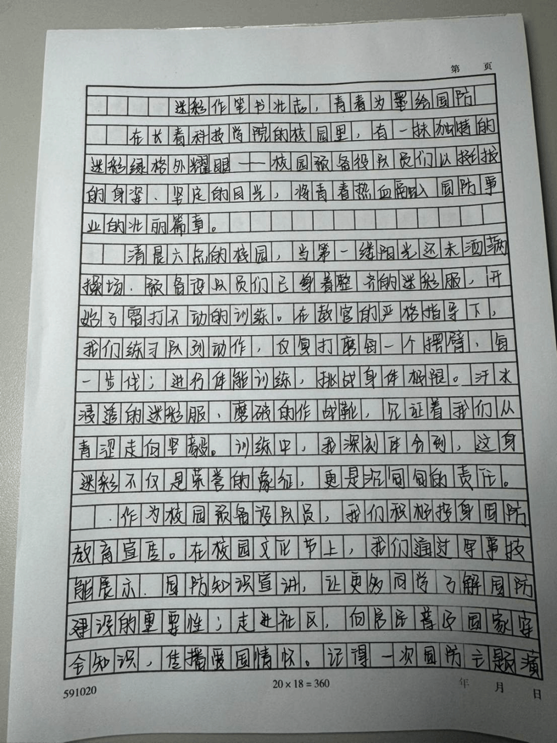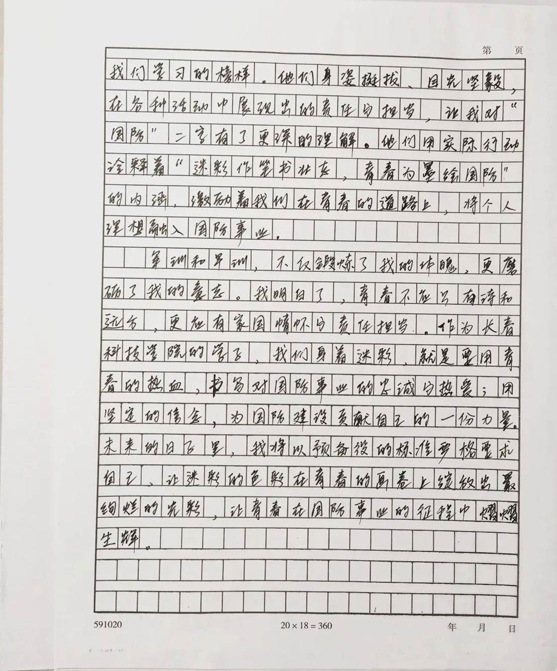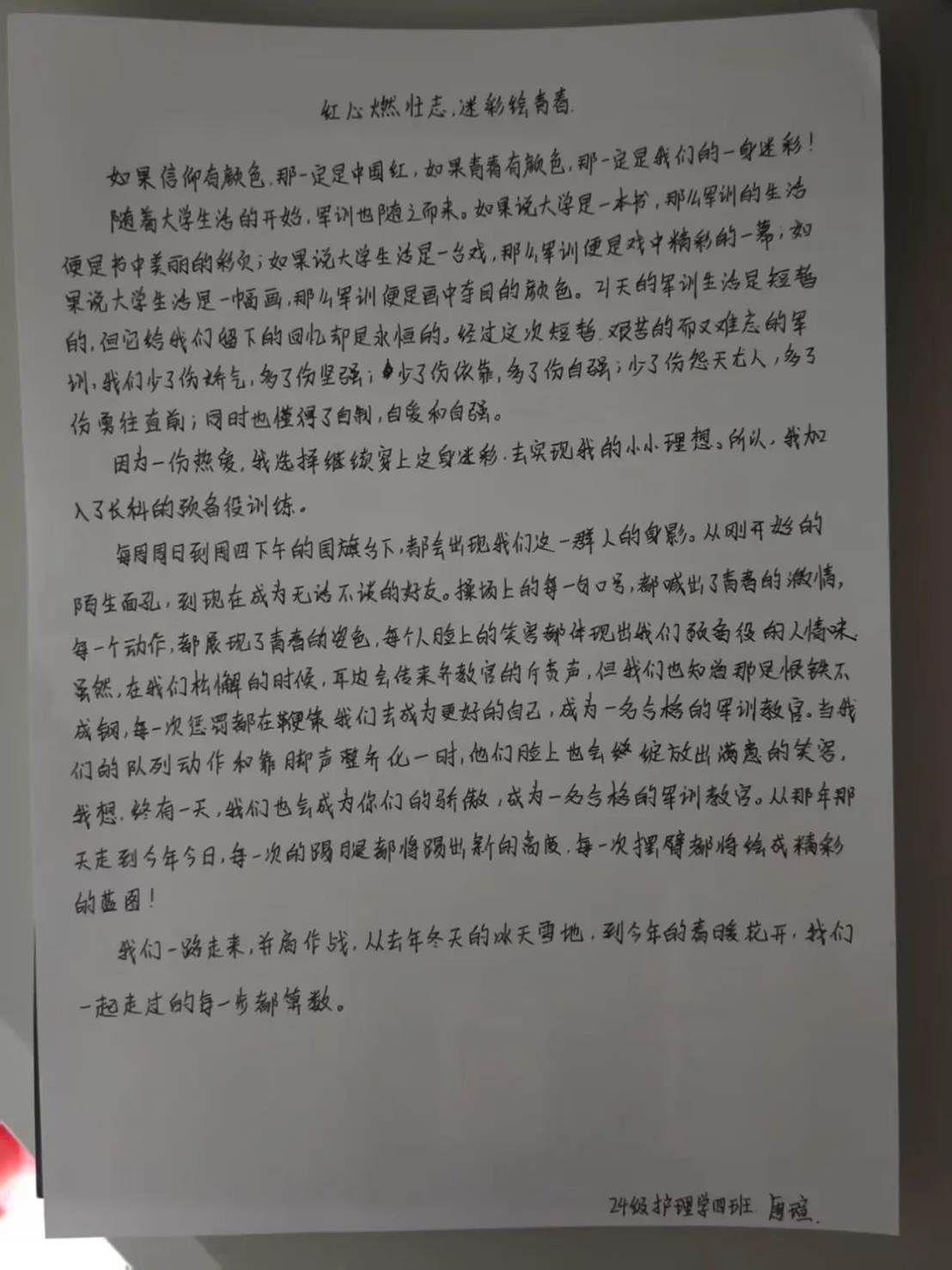 活动自开展以来,同学们踊跃参与。他们结合早训时的坚持、军训中的淬炼,生动描绘出国防力量在青年成长路上的深刻印记,字里行间满溢着炽热的爱国情怀与强烈的个人担当,一篇篇佳作展现出新时代青年对国家安全的深刻思考与守护家国的坚定信念。