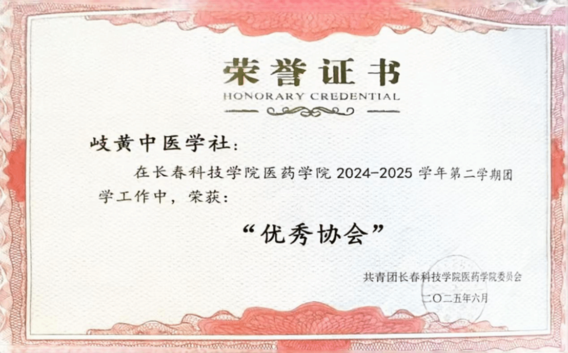 岐黄中医学社所获荣誉证书,2024 - 2025学年第二学期,因团学工作出色,被共青团长春科技学院医药学院委员会评为“优秀协会”。