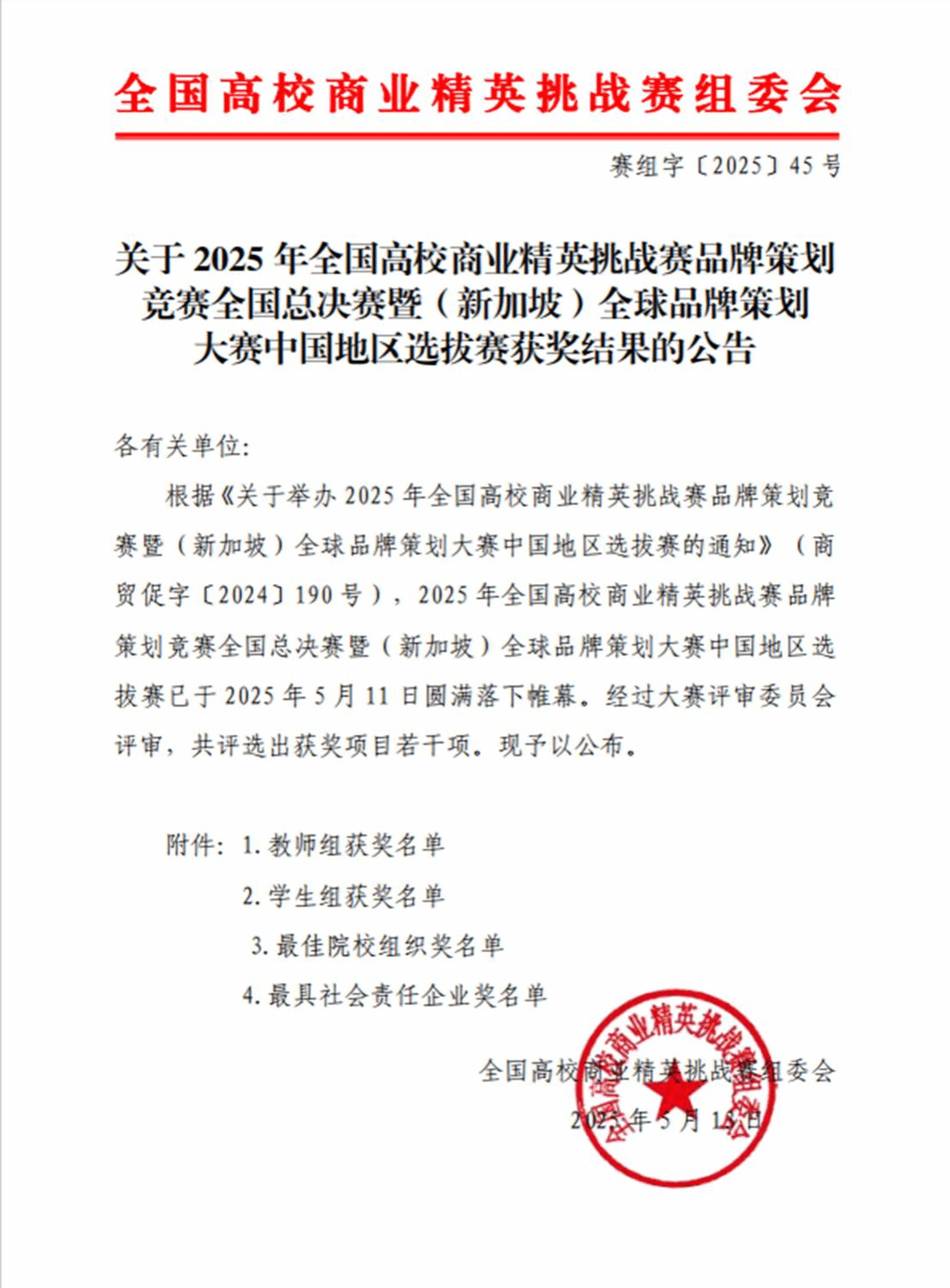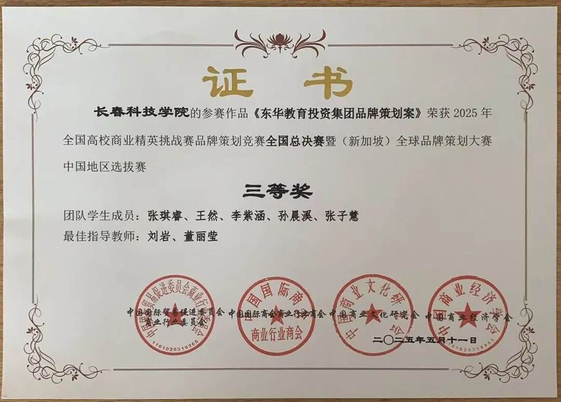 经过赛区的选拔,24级中药学专业学生张琪睿、王然、李紫涵、张子慧,24级康复治疗学学生孙晨溪的参赛项目《东华教育投资集团品牌策划案》荣获2025年全国高校商业精英挑战赛品牌策划竞赛全国总决赛暨(新加坡)全球品牌策划大赛中国地区选拔赛三等奖。