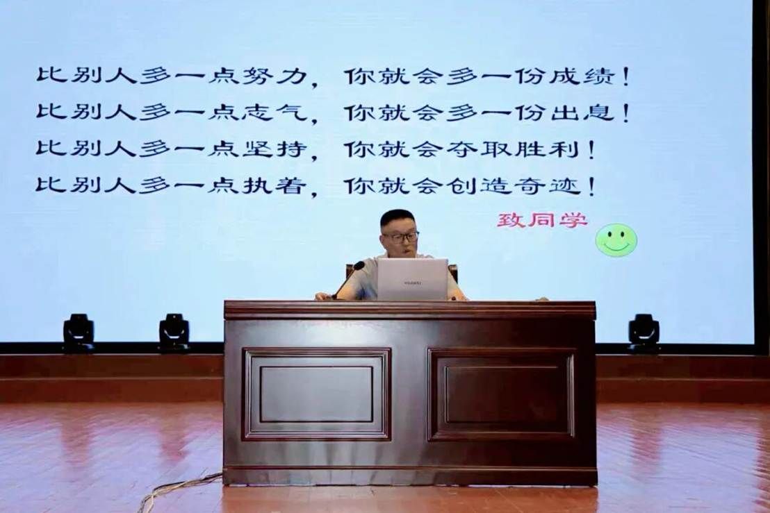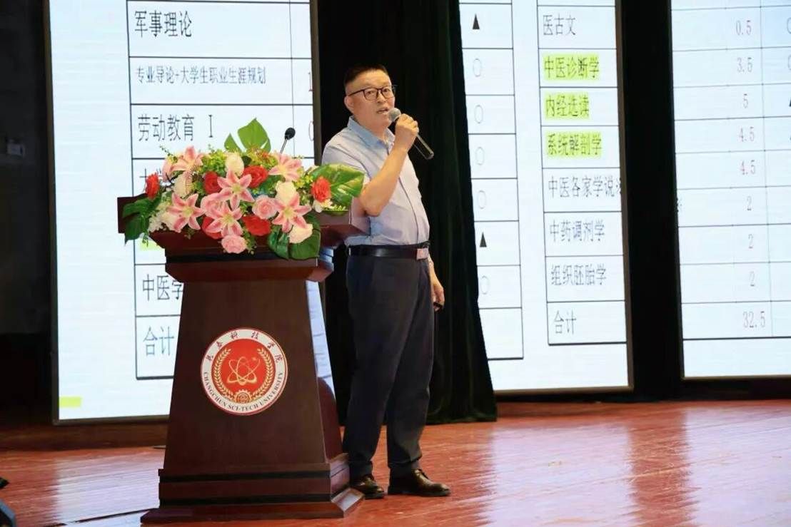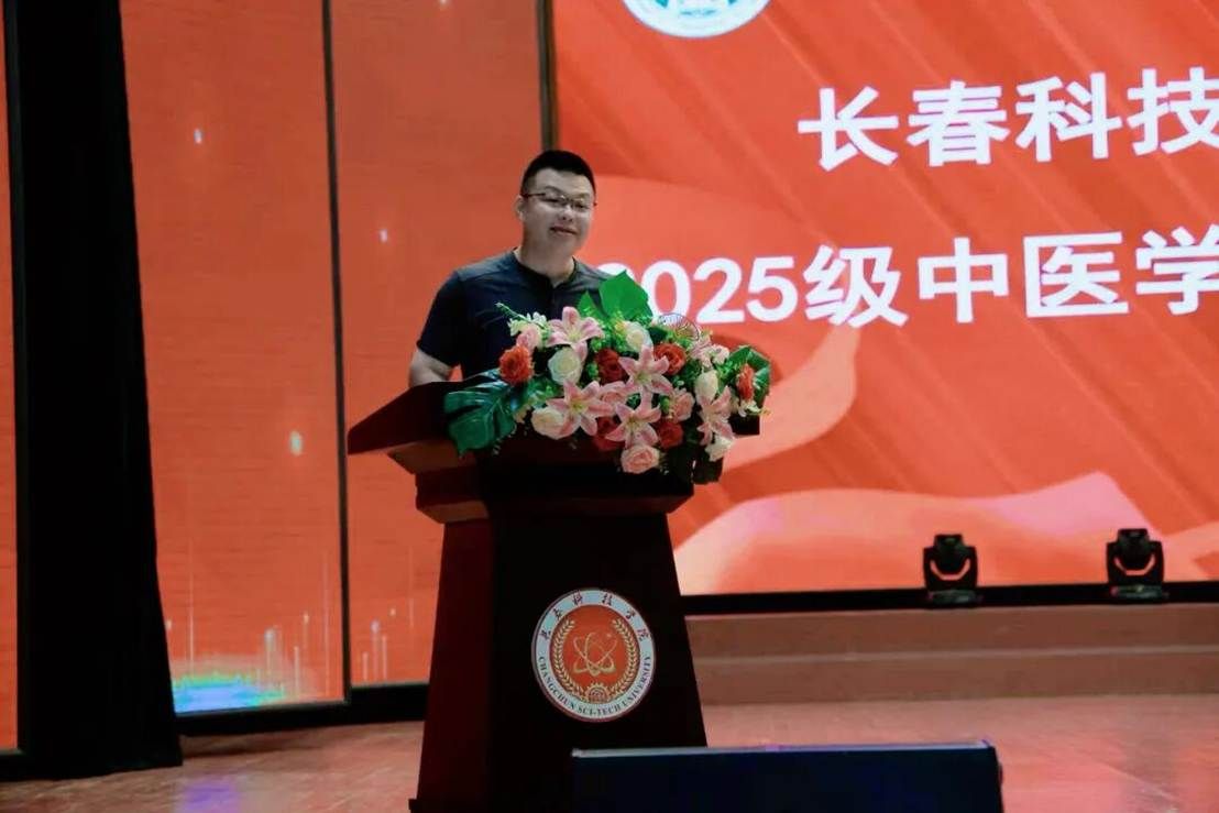 接着,中医学专业主任王德友先简要介绍了学校及医药学院的基本情况,让同学们对学习环境有初步认知。之后,他围绕中医学专业展开讲解:介绍了中医基础理论、中医诊断学等基础课程,以及中医内科学、针灸学等专业课程;说明专业学分要求,提及学校中医实训室与合作实习医院,助力同学们实现理论与临床实践结合;梳理了升学、就业等未来职业方向,同时重点强调“行医要以德为先,服务以诚为本”,引导同学们树立高尚医德。最后,他为同学们送上祝愿,并叮嘱:“比别人多一点努力,你就会多一份成绩;比别人多一点志气,你就会多一份出息;比别人多一点坚持,你就会夺取胜利;比别人多一点执着,你就会创造奇迹。”