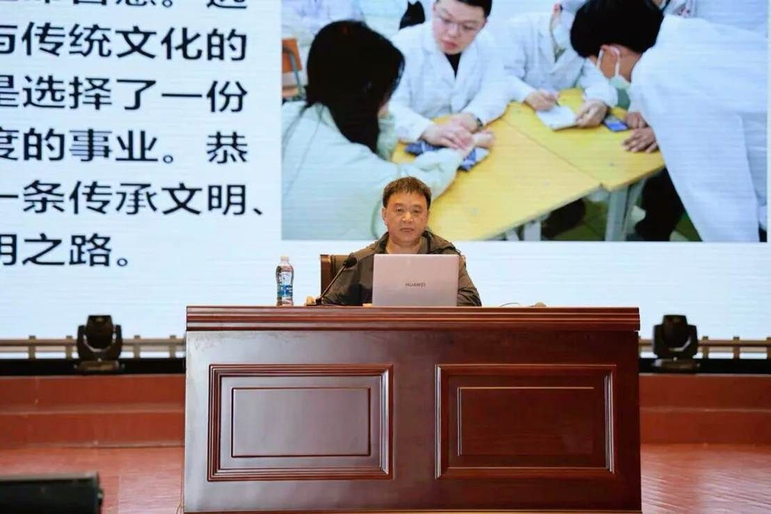 随后,副院长张凤瑞围绕“为何而来、来而学之、为何学之、如何去学、去向何方、坚定目标”这六个方面,深入讲解“如何学好中医学、如何践行中医初心”。为调动同学们的学习兴趣,他特意介绍了膻中穴与养老穴这两个具体穴位,用生动的穴位知识让大家直观感受中医的独特魅力与学习价值;同时提及中医专业往届研究生录取情况,分享优秀学长学姐的学习经验,帮助同学们清晰认识专业学习路径与未来发展方向。他还鼓励同学们以“传承不泥古,创新不离宗”为准则,坚定“学好中医、做好中医”的目标,在大学期间扎实积累知识与技能,主动探索中医的现代发展路径,共同守护与弘扬中华优秀传统医学文化。