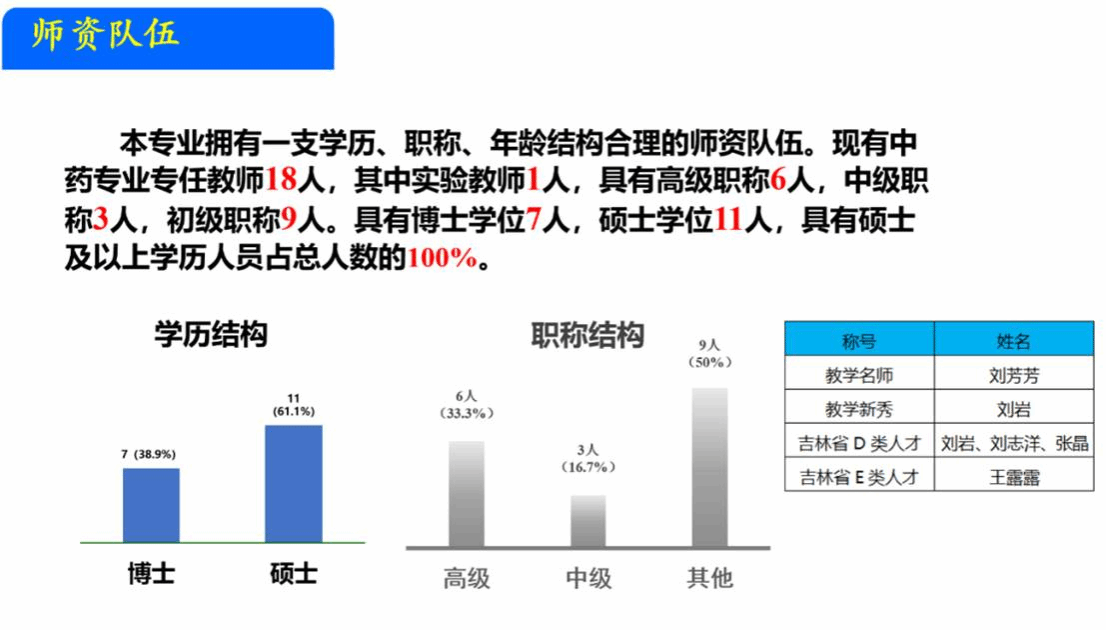 在师资力量上,刘岩主任自豪地介绍,中药学专业现有专业教师18人,均具备硕士及以上学历,其中6人拥有高级职称,7人获得博士学位,还有教学名师、教学新秀以及吉林省D类人才等优秀教师。如此强大的师资队伍,为学生的成长成才提供了有力保障。