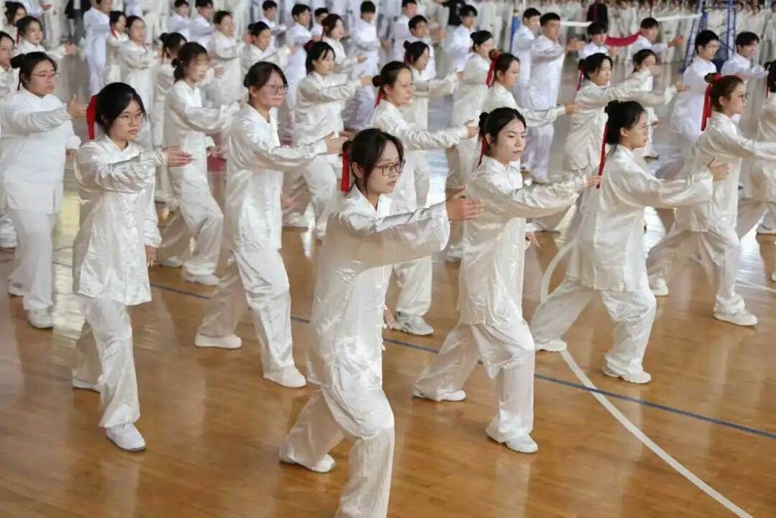 比赛开场,选手们屏气凝神,双脚慢慢分开,双手像秋叶般缓缓舒展抬起。阳光倾洒在操场上,照亮他们笔挺的脊梁和微闭的双眼——这看似普通的“起势”,其实暗藏着阴阳转化的巧妙。吸气时,手臂伸展如同阳气生发;呼气时,沉肩坠肘好似阴气收敛,一呼一吸之间,传统武术的仪式感瞬间拉满。