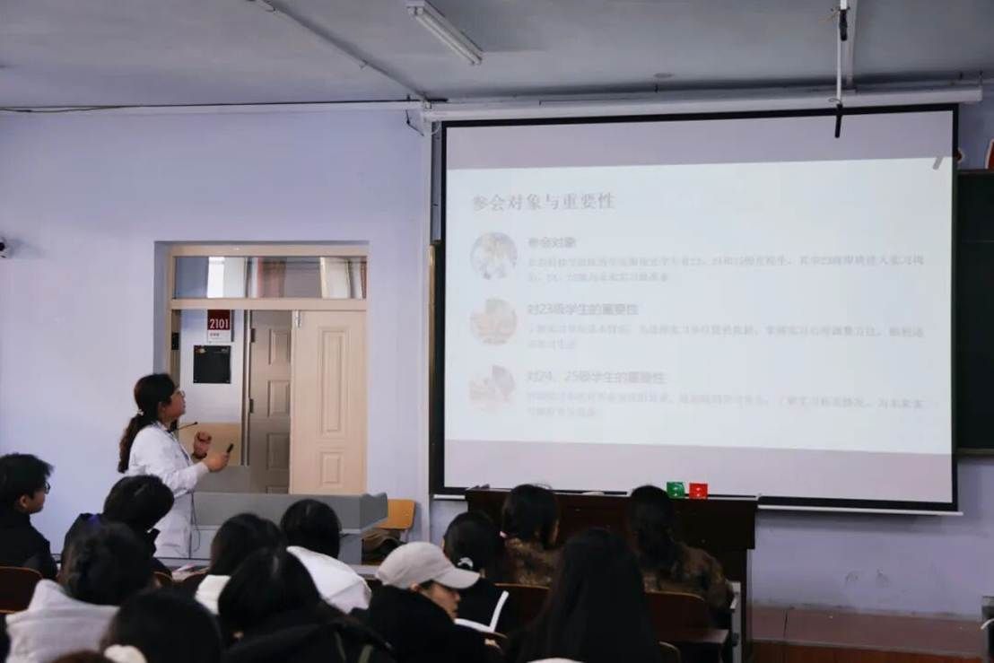 宣讲过程中,王晓晶老师聚焦同学们实习前的核心需求,重点介绍了长春一诺眼科医院、长春爱尔眼科医院、长春易视顿眼科医院等合作医院的情况:既提及各医院的特色诊疗领域与设备优势,也明确了为同学们开放的视光助理、验光、近视防控等实习岗位方向,帮助大家清晰不同单位的适配性,为选择实习单位提供依据。