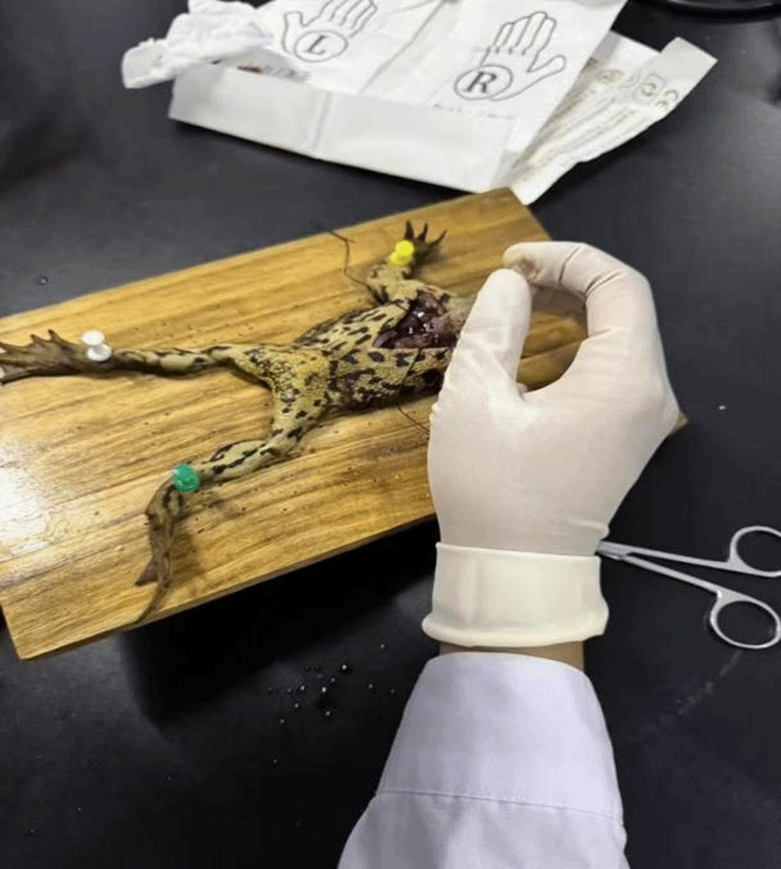 从“单纯标本制备”转向“基础操作-信号分析-临床衔接”的三阶学习路径,付立波老师的“坐骨神经—腓肠肌标本制作”实验是理解神经兴奋与肌肉收缩关系的关键载体。优化实验流程,培养学生掌握神经电生理原理,理解BL420生物信号采集系统工作机制,关联临床肌电图检查逻辑。实验过程中付老师熟练完成蟾蜍标本制备全流程,精准操作生物信号采集系统分析收缩信号,在蟾蜍脑脊髓破坏、坐骨神经游离等关键步骤中,增设临床模拟场景,如用不同力度操作模拟临床神经手术损伤风险。学生分组探究,围绕BL420系统参数调节对信号的影响、标本损伤后收缩曲线变化等问题,自主设计对照实验。教师引导对比临床肌电图检查,统一指导标准,提升学生实操与临床思维能力。