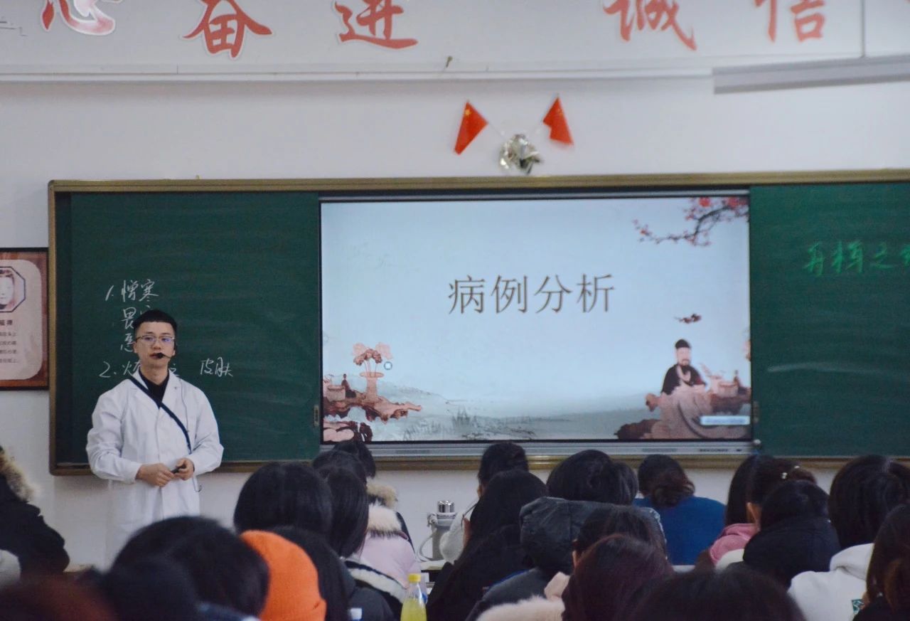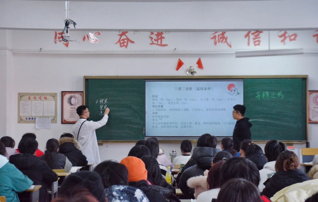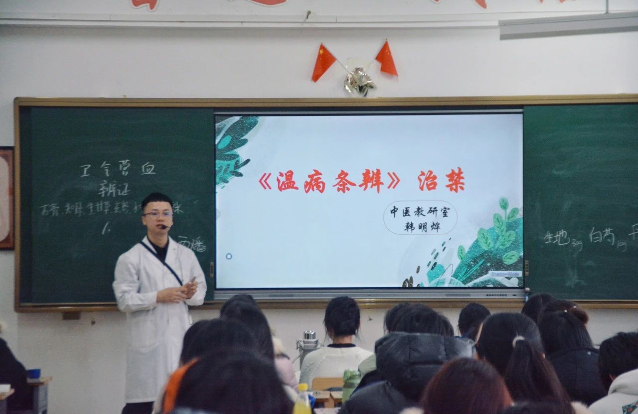 以往的重点记忆和原文背诵已经复习完毕,接下来,韩老师开始了病例的讲解,用精炼而通俗易懂的语言向同学们传授知识,通过病例学以致用,用经典理论指导临床实践,随后让同学们自己思考,上黑板写药方,强调温病的卫气营血辨证和三焦辨证思想,锻炼同学们中医辨证论治的思想。