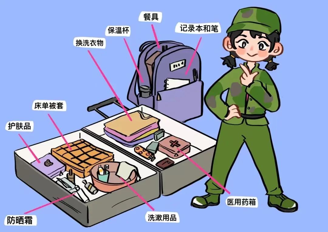 开学报道时记得去指定地点取好自己的被褥、水壶、脸盆、军训服等,并且我校是预备役院校,军训期间以及军训后,周一、周三、周五穿作训服,(衣物可以适量少带些)。