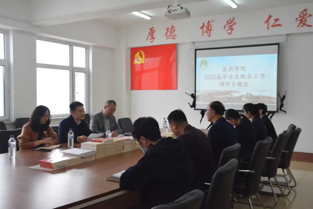 为更深入了解我院毕业生就业状况,进一步推进就业工作,4月19日下午,学校党委副书记宋学山来我院进行调研指导2023届毕业生就业工作,就业处处长于斌、就业处综合办公室主任赵莉莉陪同调研,院长闫立安,副书记陈树森、教学秘书徐楚越、中药学专业宋欢老师以及全体辅导员参加会议。