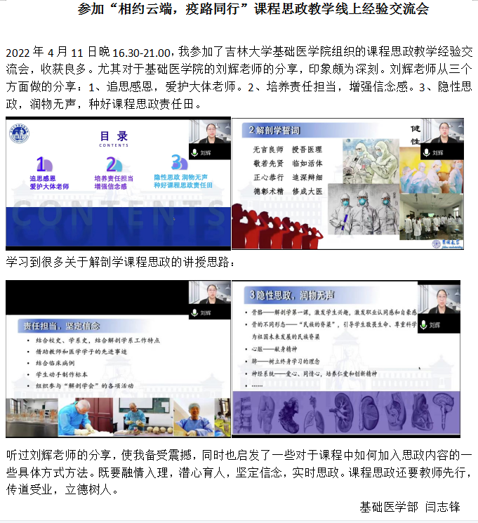 为了切实提高线上教学的育人水平,基础医学部青年教师参加吉林大学基础医学院云端课程思政教学经验交流会。生理学系的葛敬岩教授分享了“融情入理,潜心育人”,通过介绍生理学系的开学第一课设计,将思政元素在第一课渗入到全部的课程学习中。生物化学系的张纪周老师分享了“脚踏实地,思政育人——生物化学课程思政元素挖掘”,通过真实性、趣味性、同理性、时效性以及新奇性展示了生物化学课程的育人细无声。分子生物学系的王华老师分享了“医学分子生物学课程中思政元素的渗透与融合”,通过介绍分子生物学的学科特点、从科学史中挖掘出课程思政元素以及如何将思政元素与学科特点有机融合,展示了分子生物学课程思政的设计与感悟。解剖系的刘辉老师分享了“追思感恩,责任担当,隐性思政,润物无声”,让我们了解到解剖学作为特殊的一门课程,教师在授课的同时,教会了学生如何尊敬和感恩大体老师,在积极投身教学的同时,也努力种好了课程思政责任田。会后刘宏群、闫志锋两位老师分别写了学习心得,与大家分享。