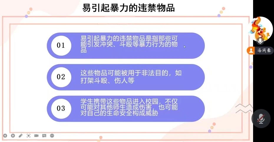 随后,学生代表介绍了一些常见的违禁物品,例如:管制刀具(包括匕首、弹簧刀、跳刀等可能造成人身伤害的刀具),易燃易爆物品(如烟花爆竹、酒精、汽油),毒品、吸毒工具及非法药品等。