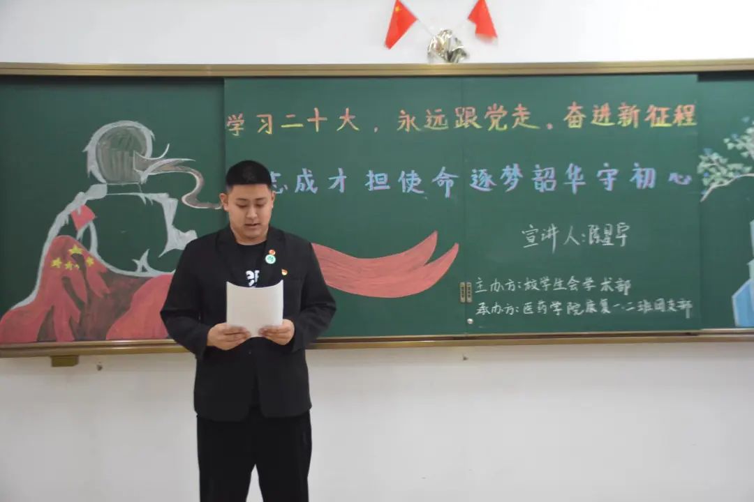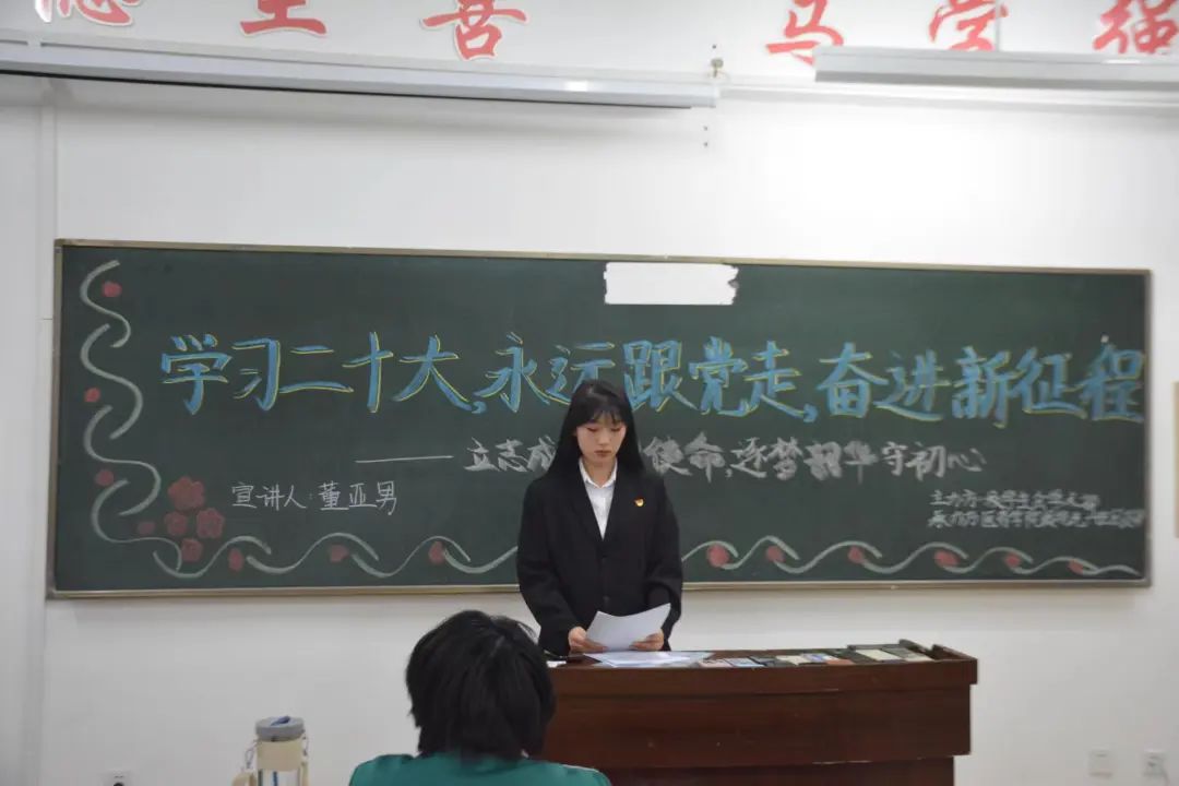 本次团会的两位宣讲人分别为20级护理七班董亚男和20级护理八班陈星宇,首先他们在班级中宣讲了本次团会的主题,让同学们对党的二十大有了更深刻的理解。通过此次宣讲,也让我们明白了建设祖国应该怀抱梦想脚踏实地,立志做有理想、敢担当、能吃苦、肯奋斗的新时代好青年!为中华民族伟大复兴而奋斗!不负韶华,撸起袖子加油干!