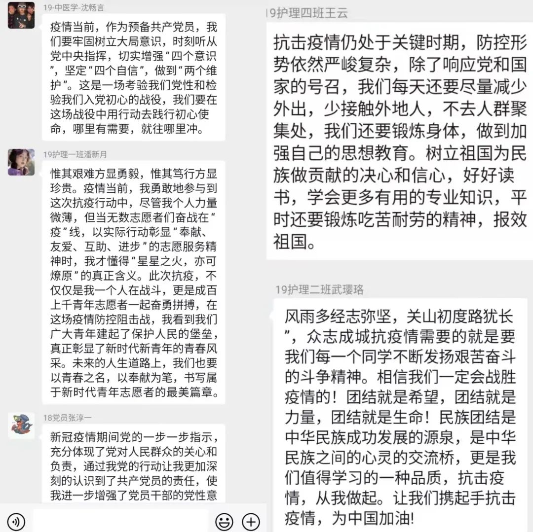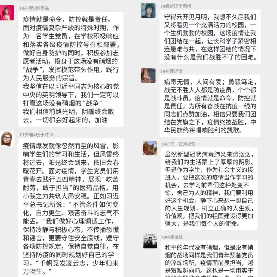 二是要加强对党中央关于疫情各项政策的学习,深刻认识到疫情防控的重要性和紧迫性,坚定不移把学校的各项决策部署落到实处。三是要讲担当,及时沟通信息,不信谣,不传谣,积极做好疫情防控的政策宣扬、信息甄别、知识传播等相关工作,以实际行动诠释一名党员的初心和使命,共同筑起抗击新型冠状病毒的钢铁长城。在疫情期间,每个人在做好自身防护的同时,迎难而上、服从命令,认清形势、扛起责任!”