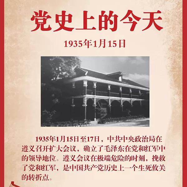 1935年1月15日至17日, 中共中央政治局在遵义召开扩大会议。会议批评第五次反“围剿”和长征以来中共中央在军事领导上的错误。