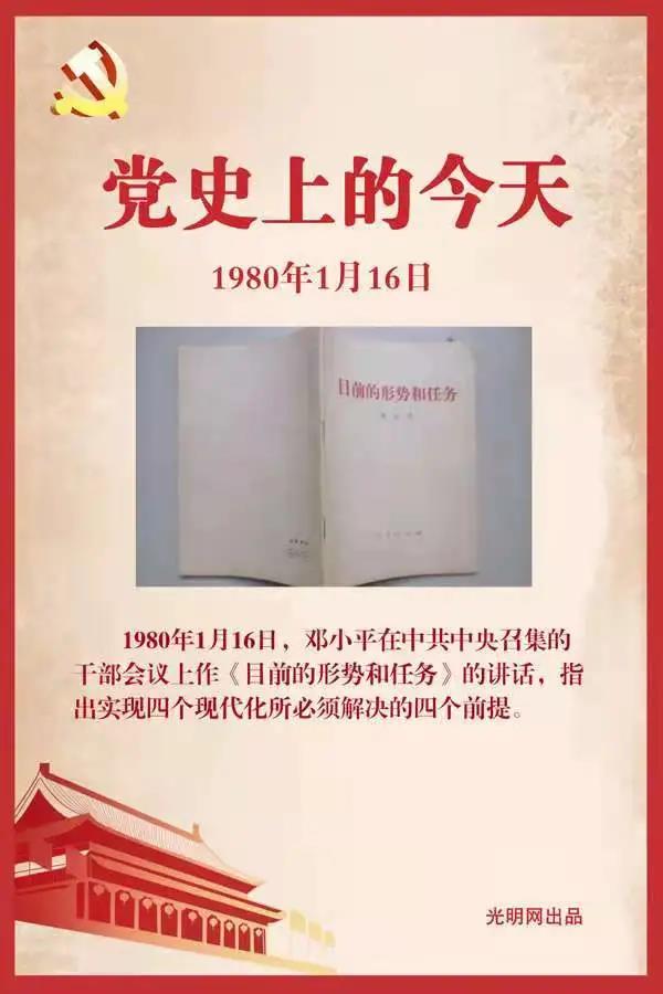 1980年,1月16日 邓小平在中共中央召集的干部会议上发表《目前的形势和任务》讲话,提出反对霸权主义、维护世界和平,台湾归回祖国、实现祖国统一,加紧四个现代化建设三大任务。