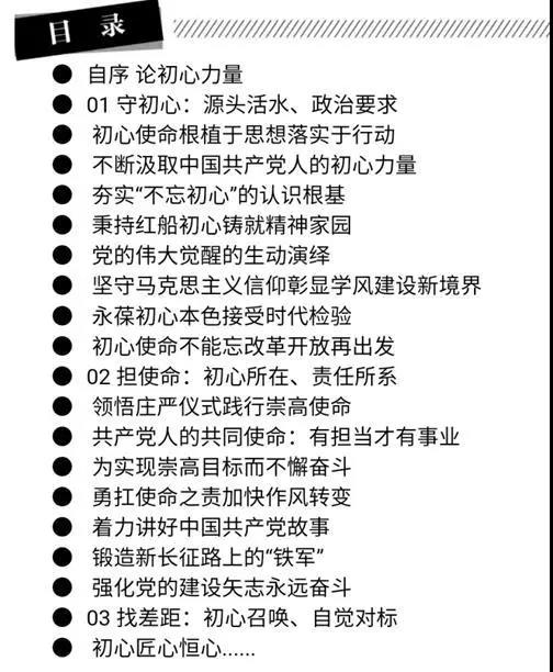 全书的构架以“守初心、担使命、找差距、抓落实”层层递进,揭示出了把初心落到实处的内在逻辑和外化指向。守初心是源头活水,包含着共产党人的政治思想、政治信仰、政治立场,集中体现在习近平新时代中国特色社会主义思想之中。担使命是神圣要务,体现的是担当精神和责任意识,就是要统揽伟大斗争、伟大工程、伟大事业和伟大梦想,实现“两个一百年”奋斗目标。找差距是基本途径,就是要自觉与党的理论和路线方针政策、党中央重大决策部署、对党员提出的新要求对标对表,发现“短板”“弱项”和不足。抓落实是根本追求,就是要在精气神、工作能力和工作水平等方面让人民群众感受到初心使命的实际伟力。