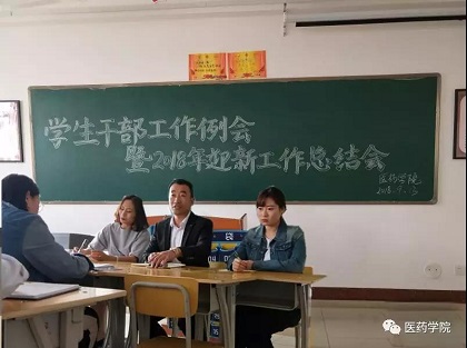为深入总结医药学院2018年迎新工作中的亮点和不足,进一步提升迎新及学生管理工作水平。9月13日中午12时,医药学院在四教405召开学生干部工作例会暨2018年迎新工作总结会。医药学院党总支副书记陈树森,学工办主任杜百晶,辅导员戴乐老师及第四届全体学生干部参加了会议,会议由副书记陈树森主持。