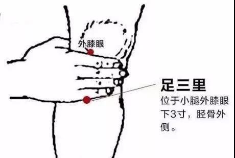 从下往上触摸小腿的外侧,左膝盖的膝盖骨下面,可摸到凸块(胫骨外侧髁)。由此再往外,斜下方一点之处,还有另一凸块(腓骨小头)。这两块凸骨以线连结,以此线为底边向下作一正三角形。而此正三角形的顶点,正是足三里穴。