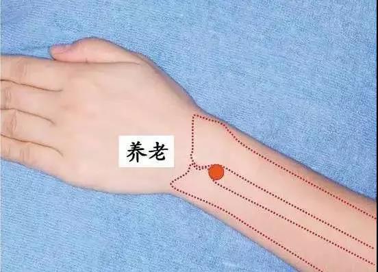 屈肘,掌心向胸,在尺骨小头的桡侧缘上,与尺骨小头近端平齐的骨缝中是养老穴。