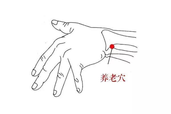 掌心向下,用另一手指按在尺骨小头的最高点上;然后掌心转向胸部,当手指滑入的骨缝中是养老穴。