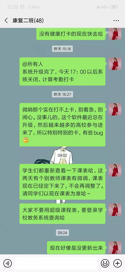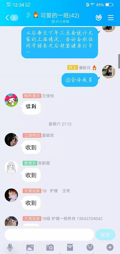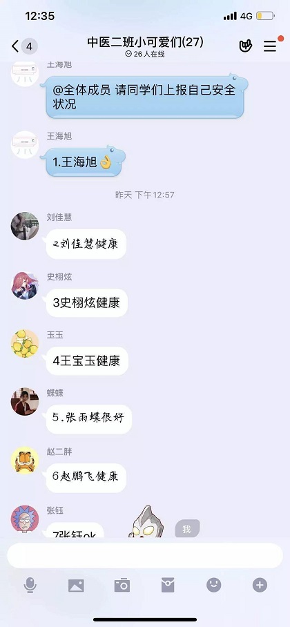 一声“班长”,责任在肩;学校有号召,他们有行动,越是困难,越要担当。身为班长每天按时收集、上报每位同学及出行情况,已经成了一种常态。打表格时一次次的核对,力求保质保量按时上交。在防控疫情的紧张时刻,班长们身上肩负的不仅仅是任务,而是对每位同学的牵挂和关心。