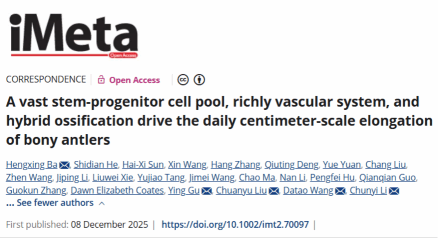 近日,《宏》(iMeta)在线刊发了长春科技学院鹿茸科学与产品技术研究所(第一单位)李春义教授、巴恒星教授团队与中国农业科学院特产研究所、华大基因等多家单位合作完成的研究成果,论文题为 “A vast stem-progenitor cell pool, richly vascular system and hybrid ossification drive the daily centimeter-scale elongation of bony antlers”(图1)。该研究首次在单细胞和分子水平上系统揭示了自然界中独一无二的“骨生长系统”...