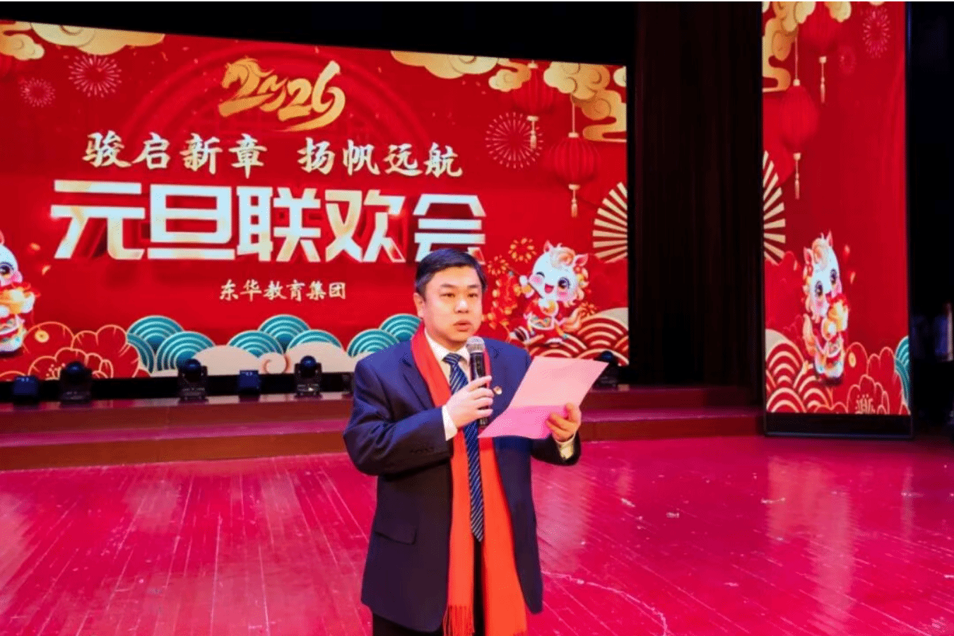 东华逐梦展宏图,骏马扬帆启新程。12月26日下午,东华教育集团2026 “骏启新章、扬帆远航”元旦联欢会在东鳌学术论坛——国际会议中心举行。吉林省河北商会党委书记、会长赵忠文,常务副会长张永雷,副会长秦长永,执行秘书长刘俐君,兴业银行长春分行副行长邵炯平、卫星广场支行副行长何为,吉林省东鳌鹿业集团销售执行总裁刘岩松,海南影业常务副总李乡壮,吉林职业技术学院校长柳森,吉林职业技师学院校长刘晓辉、长白山技师学院院长佟建业,御龙温泉度假村总经理毛凤喜等各界嘉宾莅临。长春科技学院校长栾立明、党委书记崔高嵩和学术委员会主任戚欣及校领导班子成员,与师生员工、合作单位代表及家属欢聚一堂,共迎新年。